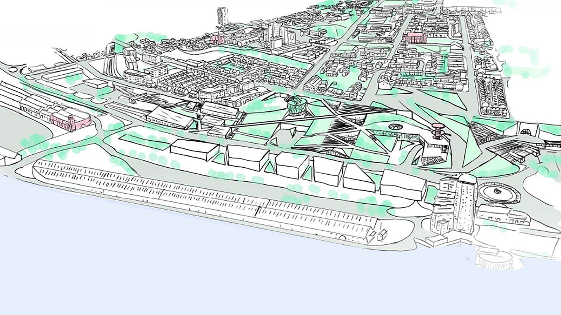 A project intending to connect Dingle above and below the hill, adding a train station and leisure spaces below a green park bridging the topographic difference. Additional residential complexes as well as civic programs celebrating the Liverpool’s "Docker's Umbrella" are considered.