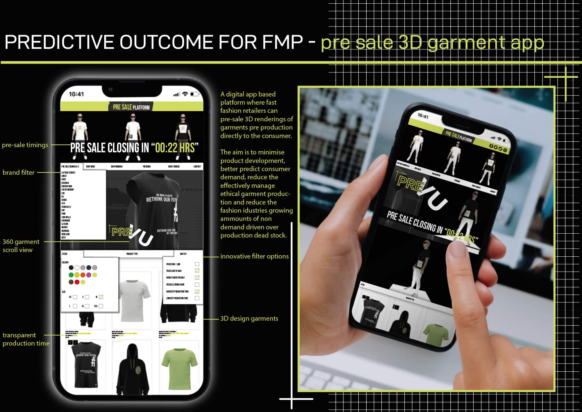I joined the MA fashion innovation and realization programme as I have spotted a gap in the market for an ecommerce fashion business model that could solve the environmental, social and ethical issues caused by overproduction and excessive produced development in the industry. My proposed concept combines the accuracy of 3D design technology, digital selling platforms, and a presale business model, to create a digital marketplace in which fashion businesses can pre-sell 3D rendered clothing directly to the consumer, minimising product development and eliminating over production.