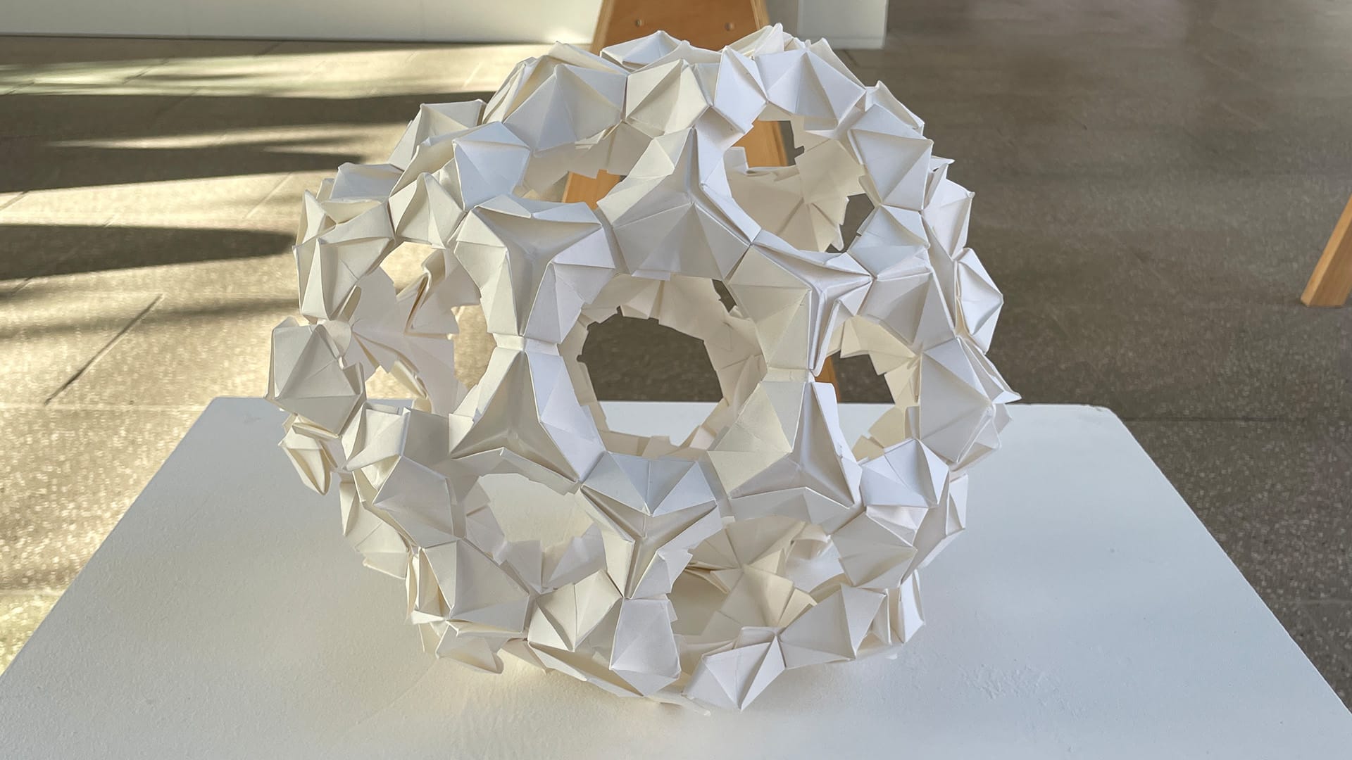‘(un)Folded’ explores how geometry can help us understand the internal workings of a virus. Using origami, she constructs geometric shapes found within a virus structure and then unfolds them, to create prints based on the crease patterns of the paper. By doing so an audience can see both the internal and external views of a virus simultaneously. It also shows how the virus creates a ‘blueprint’ of itself for replication and some of the mathematical concepts used in anti-viral research such as ‘Hamilton paths'.