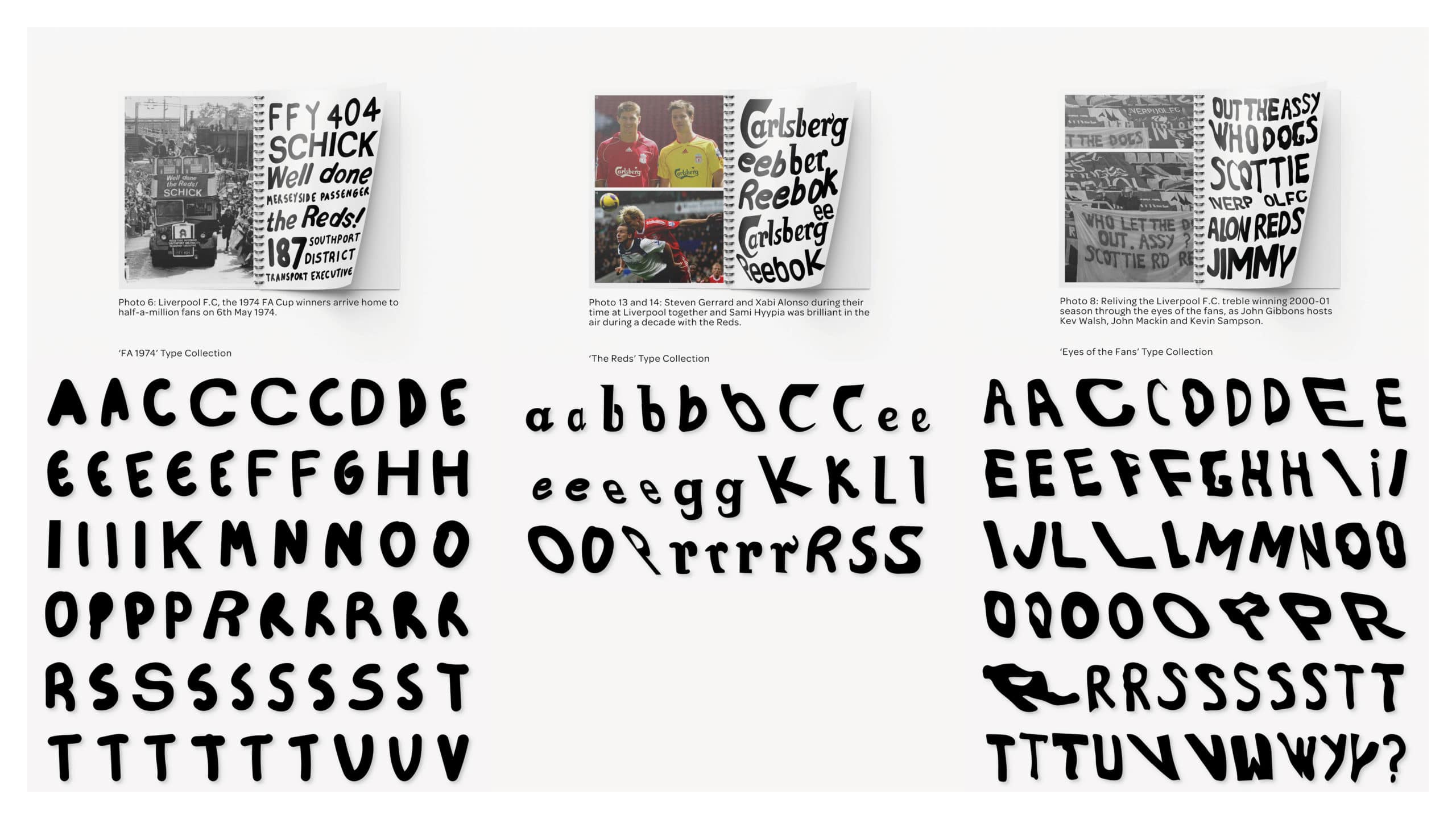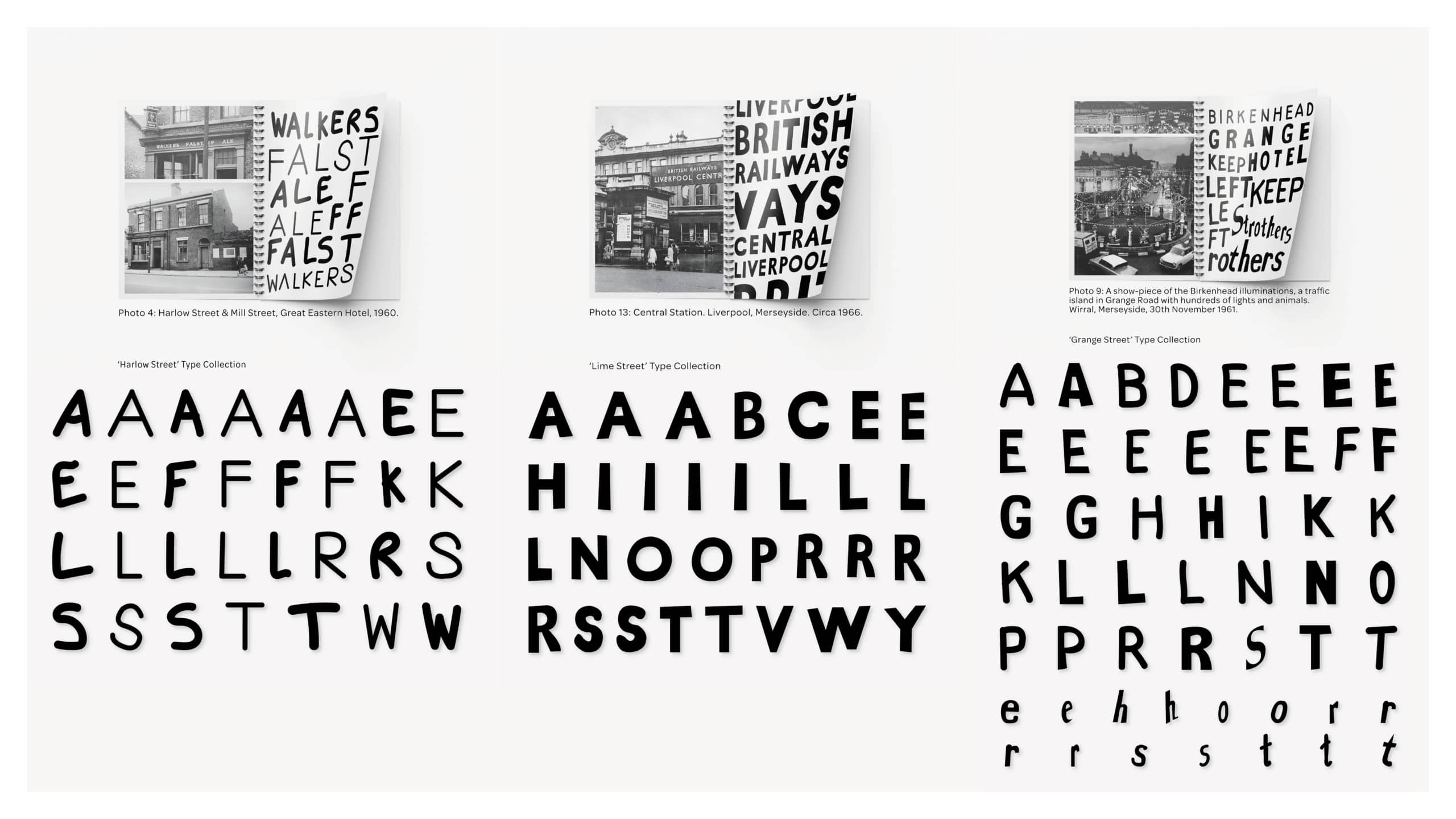 The project consists of three publications, each exploring a different theme: Old Liverpool, Liverpool F.C. and Streets of Liverpool. It investigates the collection of type and communication in Liverpool and how it was/is/could be presented (exploring the past, present and future of typefaces in Liverpool).