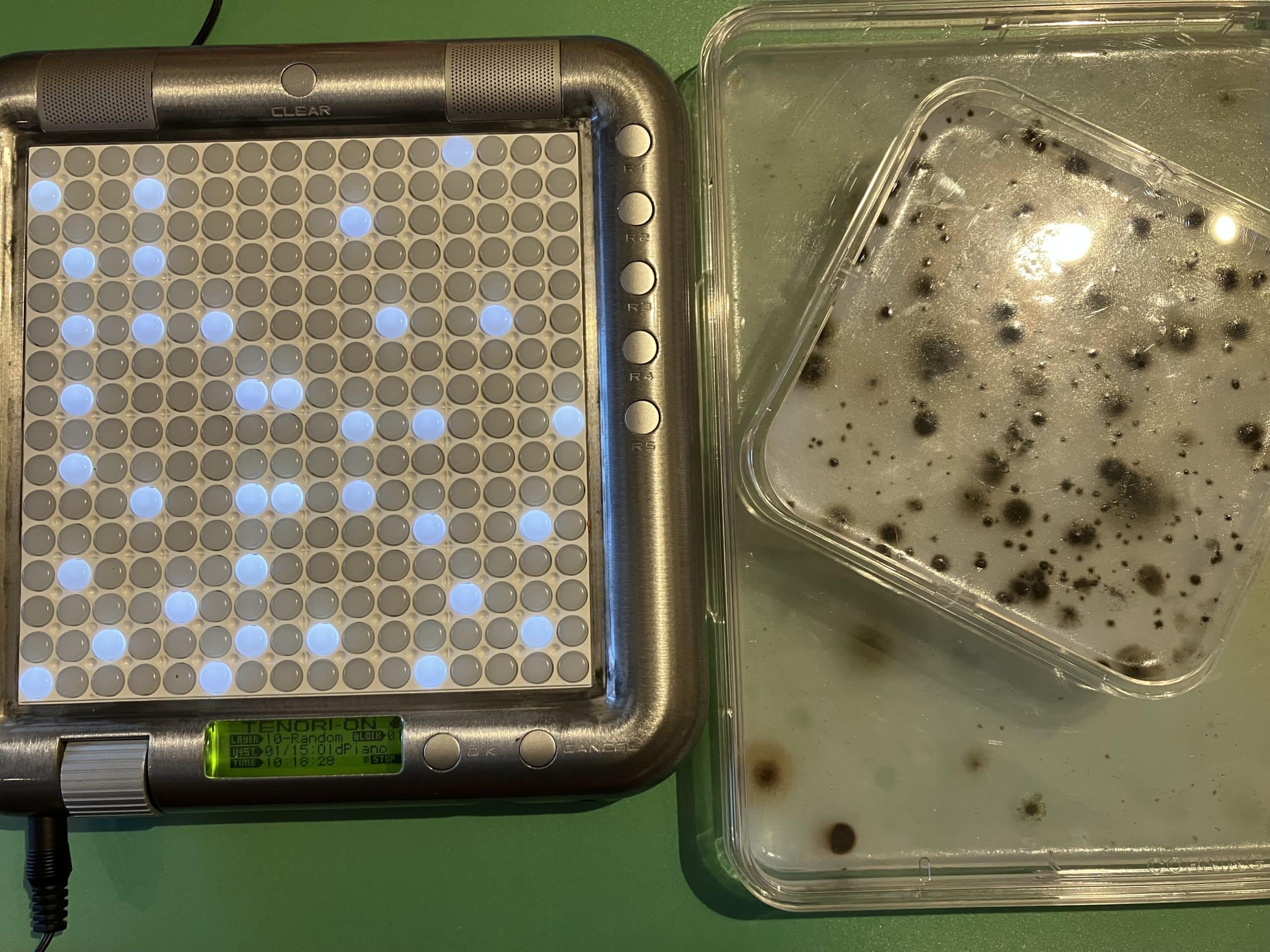 Microbiological mapping on the Tenori-On, is the sonification of microbial growth on agar as a musical interpretation of non-human life in an environment.