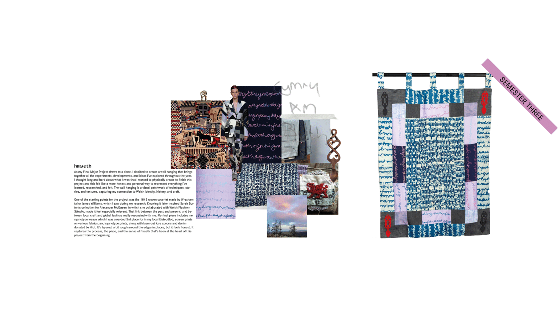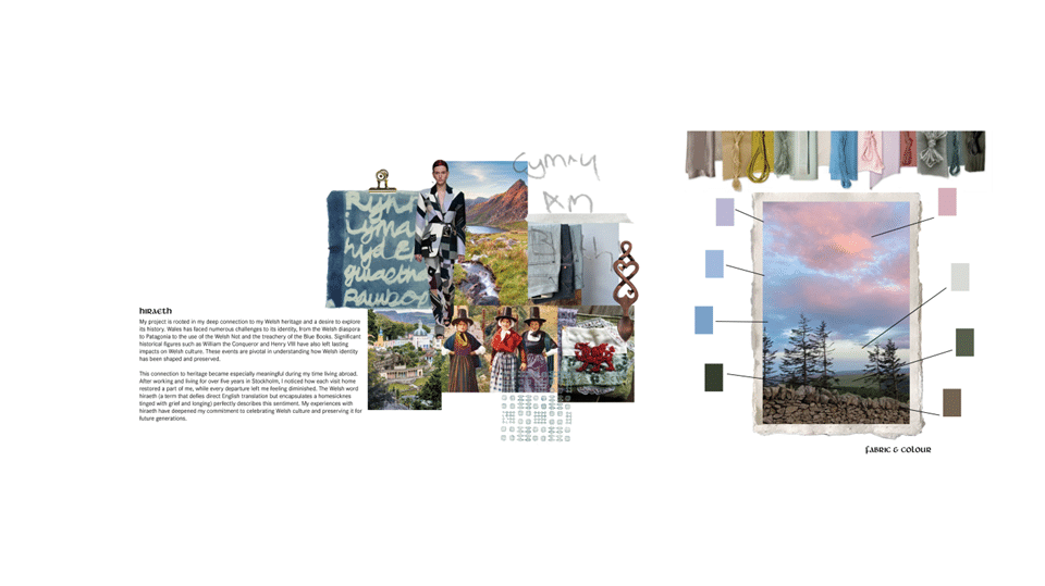 My project is rooted in my deep connection to Welsh heritage and a desire to explore the rich tapestry of its history, culture, and community. Wales has long faced challenges to its identity, shaped by moments of cultural suppression and political influence. Alongside these historical forces, I am inspired by the resilience found in traditional Welsh craft and the role it plays in preserving identity. By reconnecting with community and craft, my work aims to celebrate and reimagine what it means to be Welsh today.